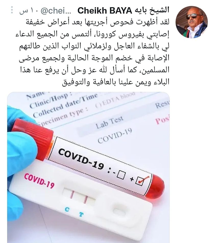 قال رئيس الجمعية الوطنية الموريتانية الشيخ ولد بايه في تدوينة له على حسابه بتويتر : "لقد أظهرت فحوص أجريتها بعد أعراض خفيفة إصابتي بفيروس كورونا، ألتمس من الجميع الدعاء لي بالشفاء العاجل ولزملائي النواب الذين طالتهم الإصابة في خضم الموجة الحالية ولجميع مرضى المسلمين، كما أسأل لله عز وحل أن يرفع عنا هذا البلاء ويمن علينا بالعافية والتوفيق"