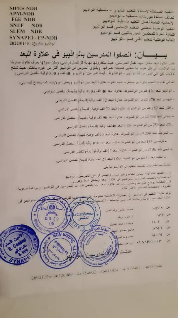 أصدرت ست نقابات للتعليم بمدينة نواذيبو بيانا مشتركا طالبت فيه بإنصاف المدرسين بانواذيبو في علاوة البعد، بشكل عاجل وفوري حسب البيان الذي جاء فيه: