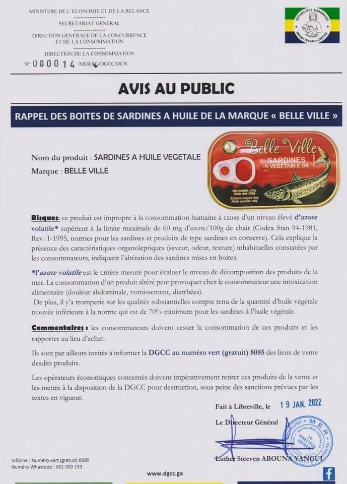 حذرت مصالح حماية المستهلك في الغابون من استهلاك السردين المسمى " Belle Ville" لارتفاع نسبة مادة "الآزوت" إلى ما فوق 60/100 غ المسموح بها. وكذلك لتصنيعها من مادة اولية غير طازجة وبالتالي نسبة لازوت فولاتيل مرتفعة جدا، وكمية الزيت النباتي أقل من المفترض لضمان حفظ عال لهذه النوعيات من السردين ولكن هذا لاينطبق إلا على هذه الماركة فقط.