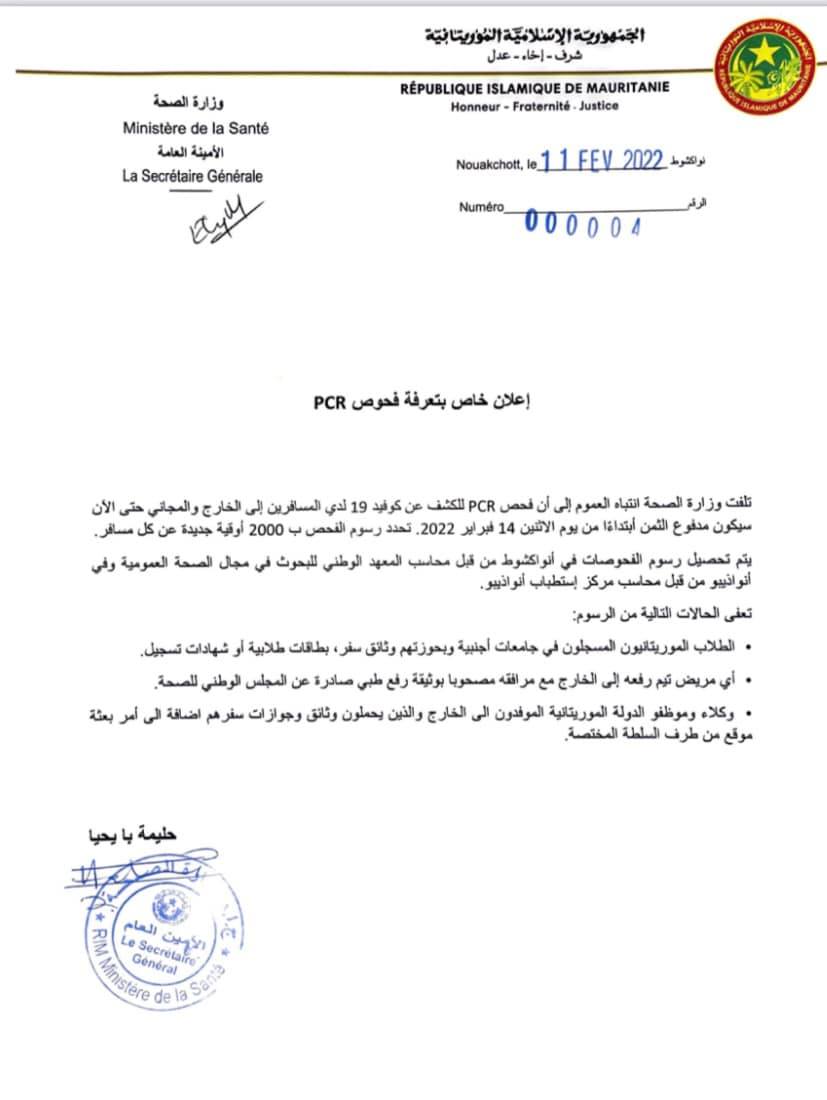 أعلنت وزارة الصحة الموريتانية رفع المجانية عن فحص PCR للكشف عن كوفيد 19، وقال الوزارة في بيان لها إن الفحص المذكور " سيكون مدفوع الثمن (2000 أوقية جديدة)، وذلك ابتداء من الاثنين المقبل (الموافق 14 فبراير الجاري).