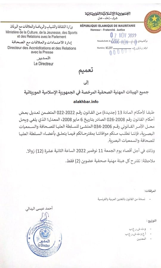 وأشارت الهابا في تعميم صادر عنها إلى أن هذا الإعلان يأتي طبقا لأحكام المادة: 13 (جديدة) من القانون رقم: 022 – 2022 المتضمن تعديل بعض أحكام القانون رقم: 034 – 2008 الصادر بتاريخ: 06 مايو 2008 المعدل، الذي يلغي ويحل محل الأمر القانوني رقم: 034 – 2006 المنشئ للسلطة العليا للصحافة والسمعيات البصرية.
