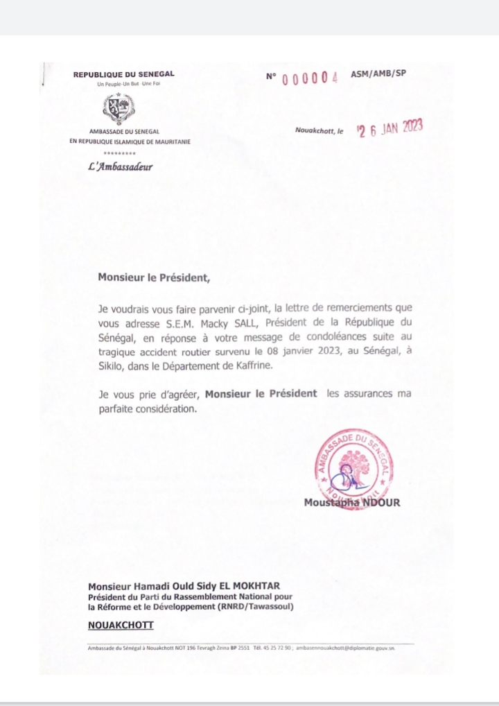 ووصلت رسالة الرئيس السنغالي ماكي صال إلى الحزب عن طريق السفارة السنغالية بنواكشوط، مرفقة برسالة إحالة موقعة من طرف السفير مصطفى اندور.