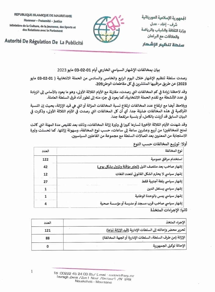 رصدت سلطة تنظيم الإشهار خلال اليوم الرابع والخامس والسادس من الحملة الانتخابية ( 01-02-03 مايو 2023) عن طريق مراقبيها المنتشرين في كل مقاطعات الوطن209.