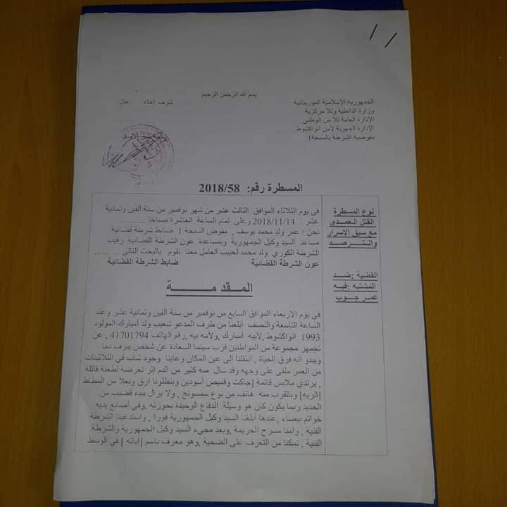 قدمت الشرطة الموريتانية روايتها الرسمية لحادثة وفاة الشاب عمر جوب قبل يومين في مفوضية السبخة ـ ووفق بيان الشرطة فإن المعني كان في شجار مع بعض رفاقه، “بالاقتراب من مكان الواقعة، اتضح أن الأمر يتعلق بثلاثة أشخاص يقومون بالاعتداء على رفيقهم الرابع، وهو (عمار چوپ) الذي كان وقتها في وضعية شبه فقدان كامل للوعي، نتيجة استخدام المؤثرات العقلية”.