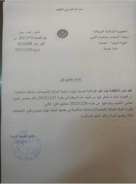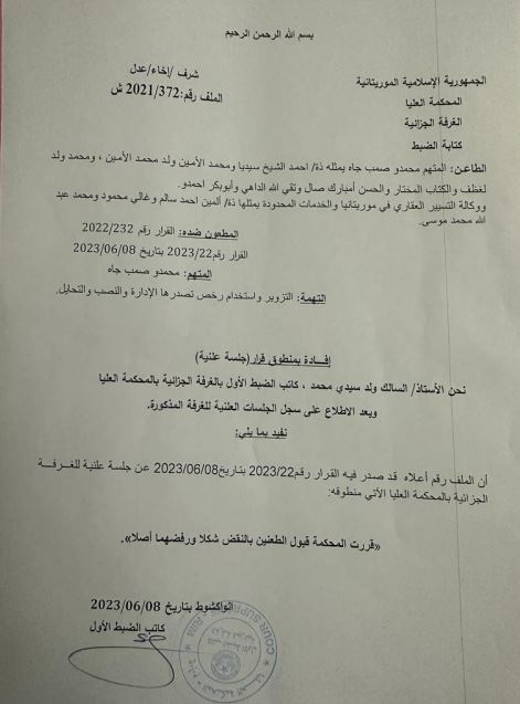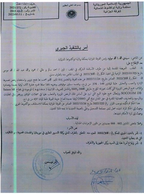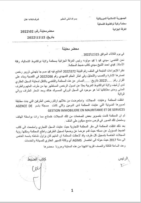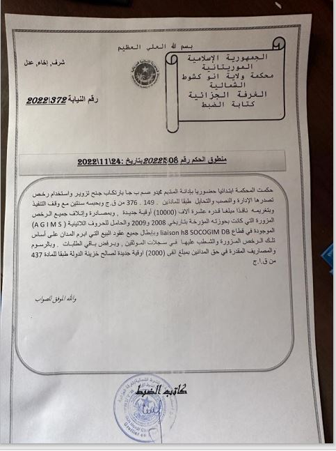 أصدرت المحكمة الابتدائية في نواكشوط الشمالية حكمها رقم: 308/2022، بالسجن لمدة سنتين ضد المتهم محمدو صامبا ديا بتهمة التزوير والنصب والتحايل. وبمصادرة وإتلاف جميع الرخص المزورة التي كانت بحوزته المؤرخة بتاريخ 2009/2008 والحاملة للأحرف اللاتينية AGIMS الموجودة في قطاع تيارت LAIASON H8 SOCOGIM DB، وبإبطال جميع عقود البيع التي أبرم محمدو صامبا ديا على أساس تلك الرخص المزورة، والشطب عليها في سجلات الموثقين، واستأنف صامبا ديا الحكم المذكور وأكدته محكمة الاستئناف فقام بالطعن في قرار محكمة الاستئناف الذي أكدته المحكة العليا بصفة نهائية في يونيو 2023، وقد حصلت AGIMS على التنفيذ الجبري لمضمون الحكم 308/2022، المؤكد من طرف محكمة الاستئناف والمحكمة العليا وذلك بموجب الأمر رقم: 07/2023 بتاريخ: 11/01/2023.