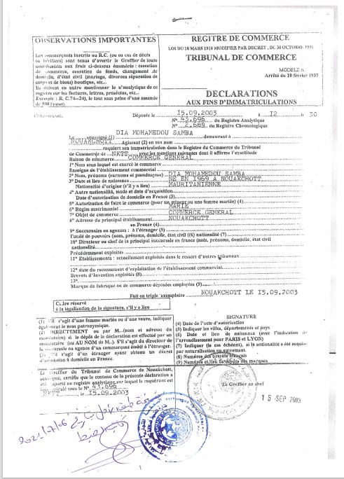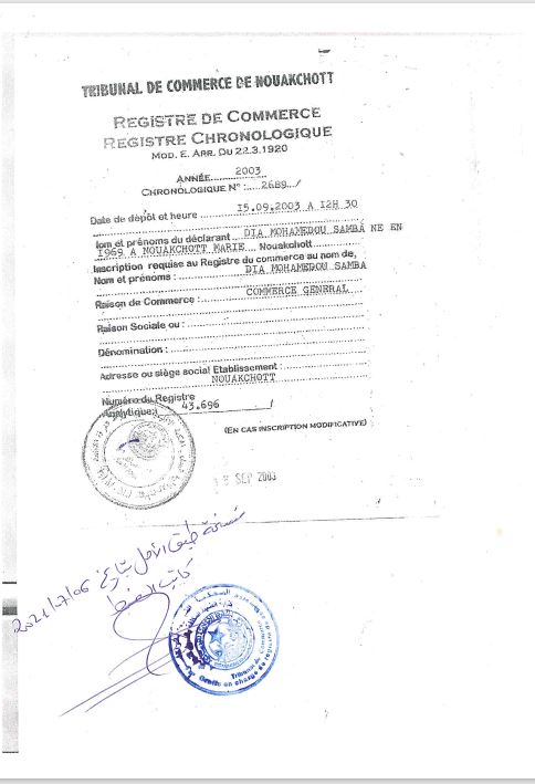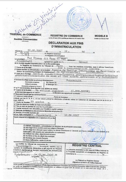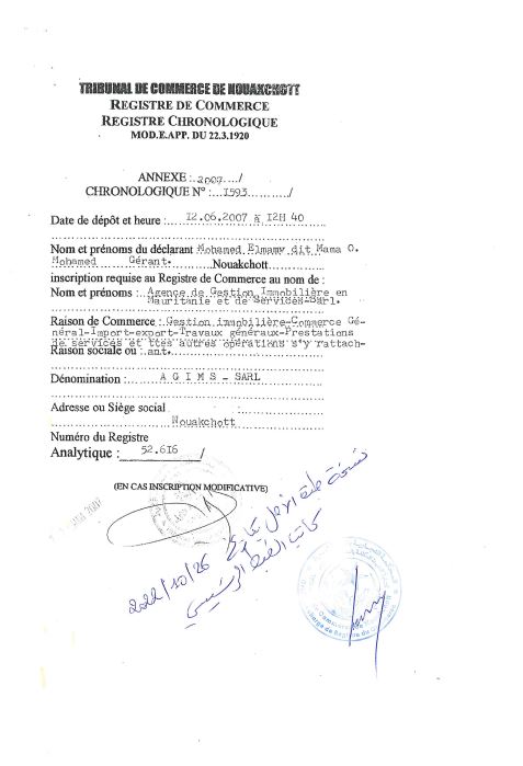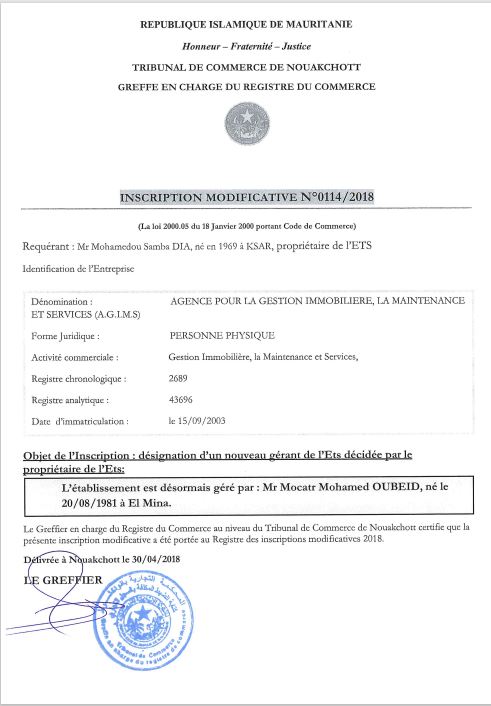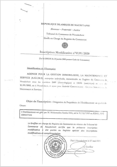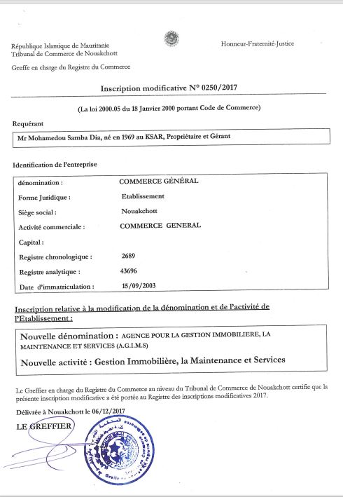 في عام 2017، بعد ثماني سنوات، قام السيد محمدو صامبا ديا بتحويل مؤسسته للتجارة العامة التي تأسست في عام 2003 إلى وكالة لتسيير العقارات والصيانة والخدمات باختصار أطلق عليها AGIMS. إلى هذا الحد، لم تكن هناك مشكلة كبيرة: فلو افترضنا أن الوكالتين قد تحملان نفس اختصار الأحرف اللاتينية، والأمر وإن كان مريبا فإنه يبدو معقولا أحيانا من باب الصدف، غير أن السيد محمدو صامبا ديا كان يخطط لهدف آخر كما سنرى: