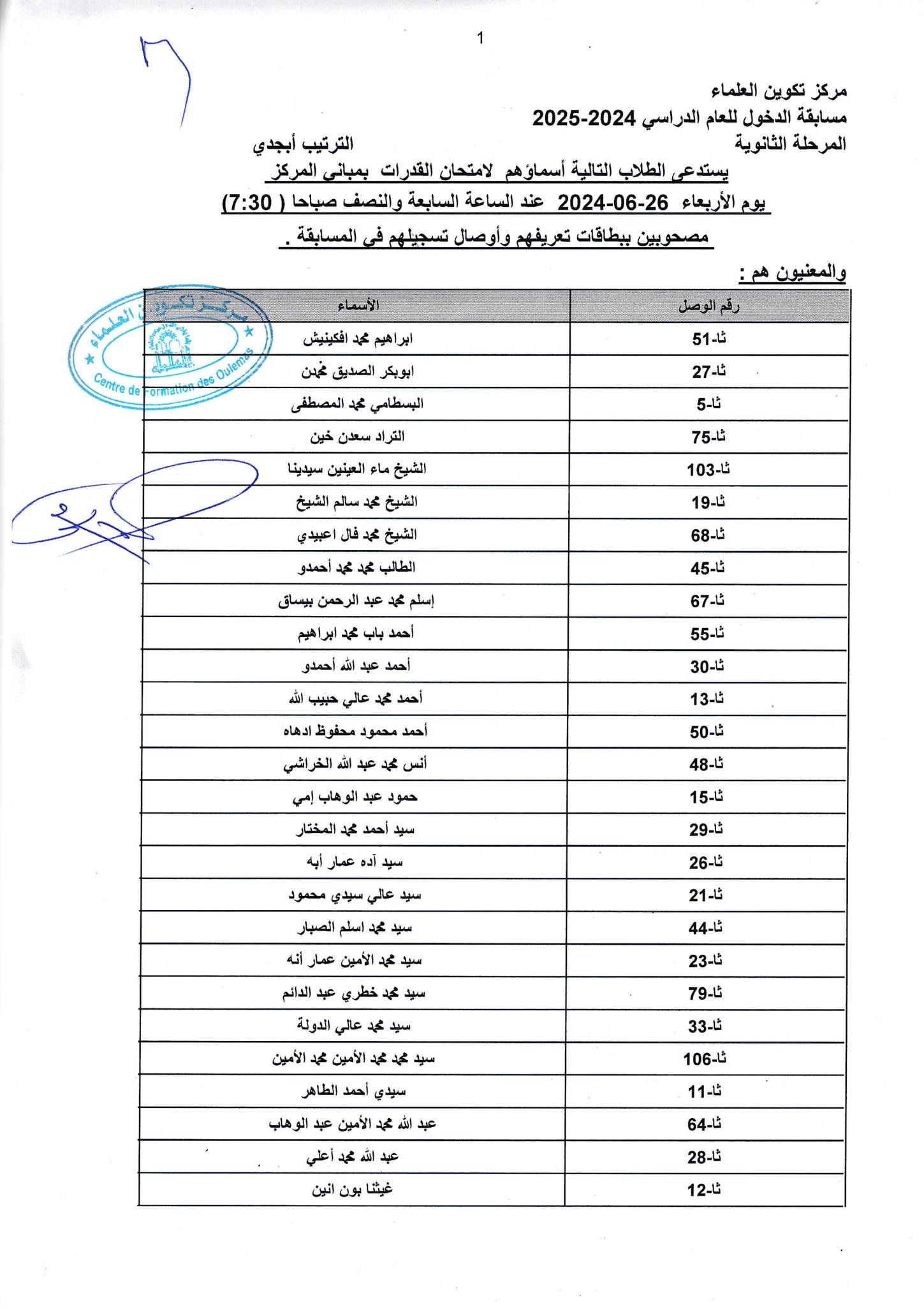 يستدعى الطلاب التالية أسماؤهم لامتحان القدرات بمباني مركز تكوين العلماء ، وذلك يوم الأربعاء 26 / 06 / 2024م عند الساعة السابعة والنصف صباحا ( 07:30 ) بمباني مركز تكوين العلماء مصحوبين ببطاقات تعريفهم وأوصال تسجيلهم