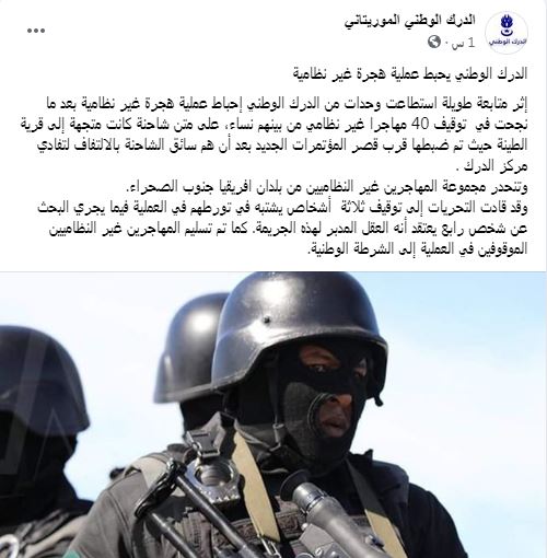 الفكر (نواكشوط): نشر الدرك الوطني اليوم على صفحته أنه إثر متابعة طويلة استطاعت وحدات من الدرك الوطني إحباط عملية هجرة غير نظامية بعد ما نجحت في توقيف 40 مهاجرا غير نظامي من بينهم نساء، على متن شاحنة كانت متجهة إلى قرية الطينة حيث تم ضبطها قرب قصر المؤتمرات الجديد بعد أن هم سائق الشاحنة بالالتفاف لتفادي مركز الدرك .