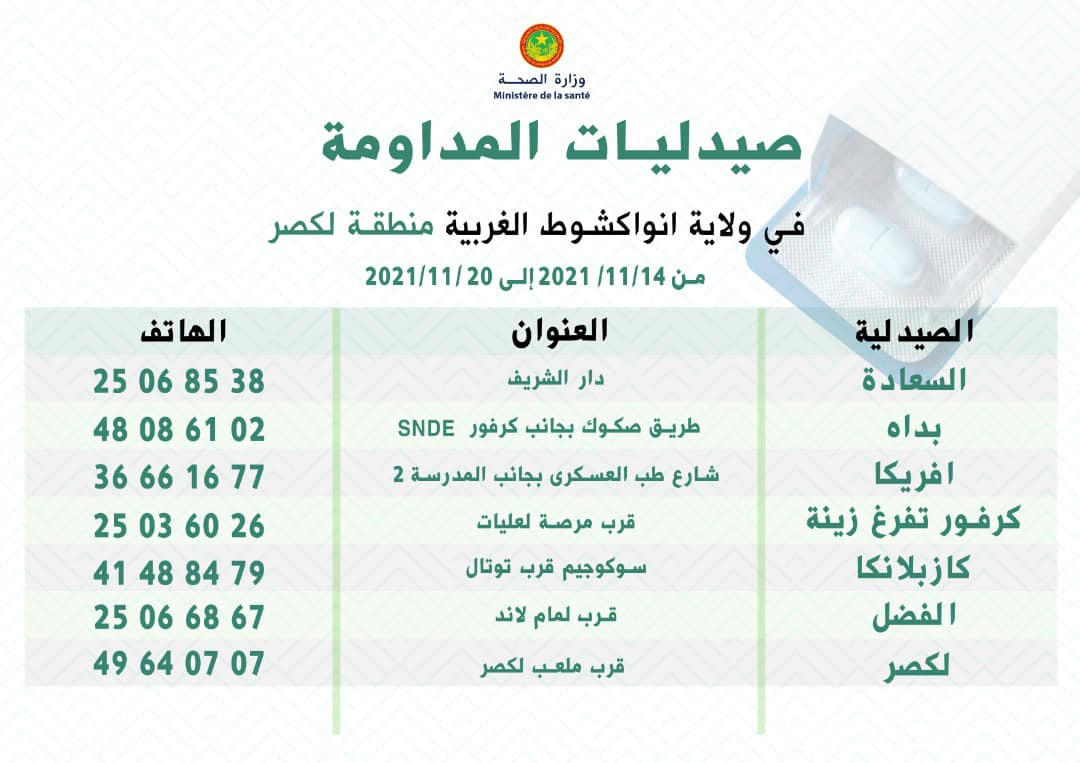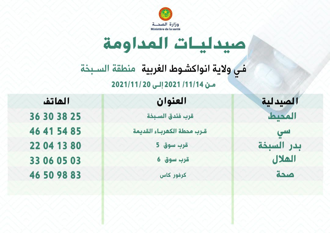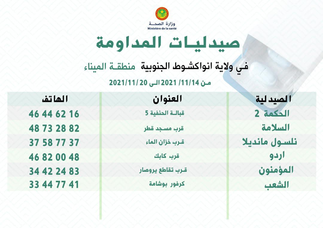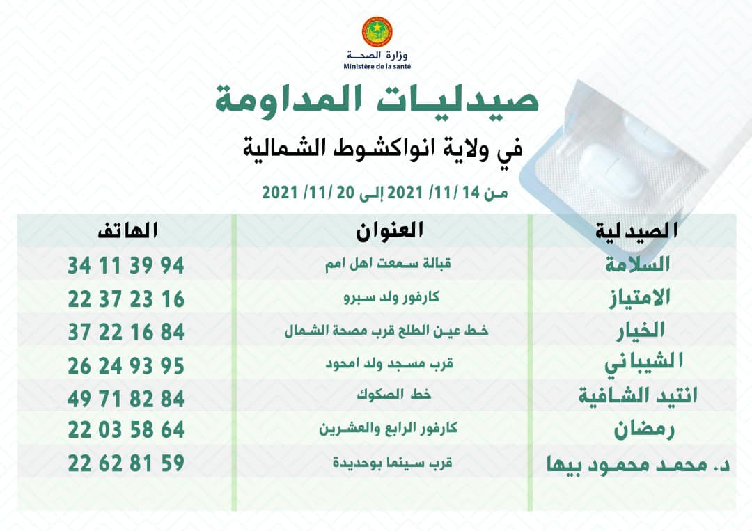 وزارة الصحة تنشر قائمة صيدليات المداومة في ولايات نواكشوط من 14 - 20 نوفمبر الجاري (صور)
